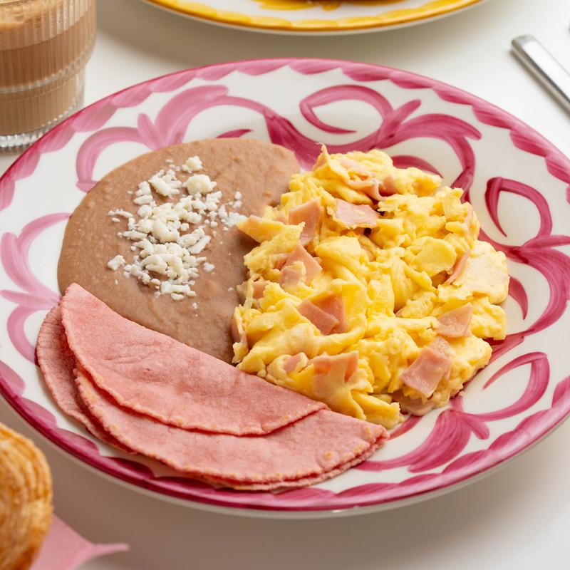 A classic Mexican breakfast — scrambled eggs with ham, served with refried beans and two handmade tortillas, your choice of flour or pink corn