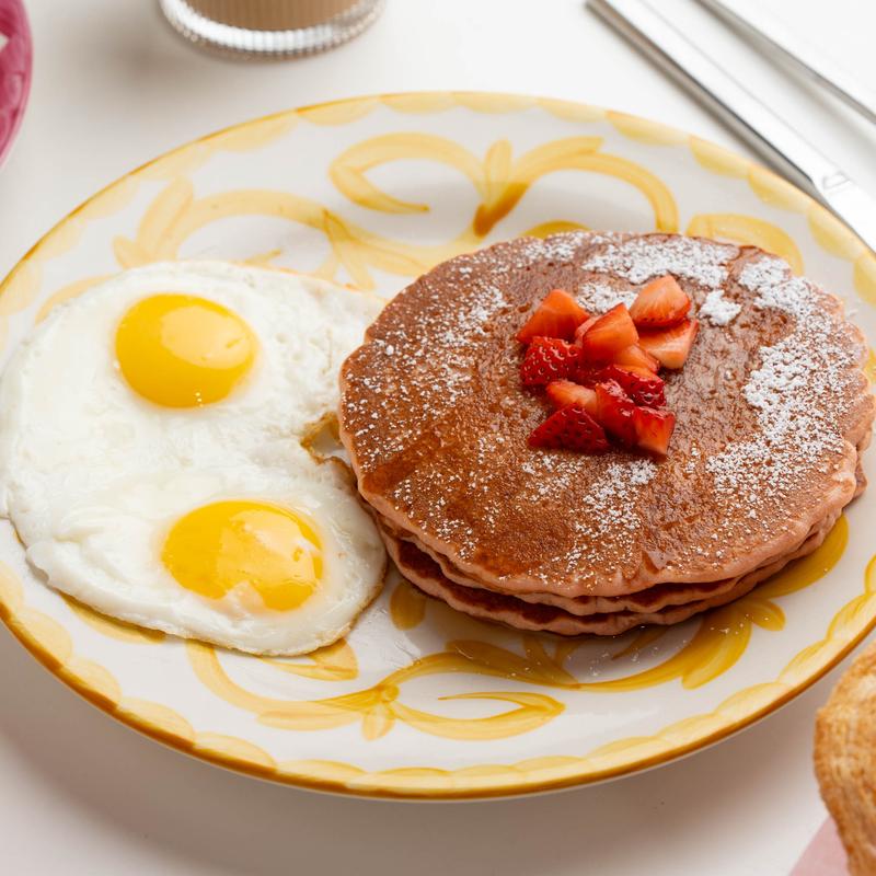 Fluffy pancakes made to order, served warm with a pat of butter and drizzledwith rich, pure maple syrup, topped with fresh strawberries and dusted with powdered sugar. Served with two eggs your way • Add cajeta and lechera +$1.00