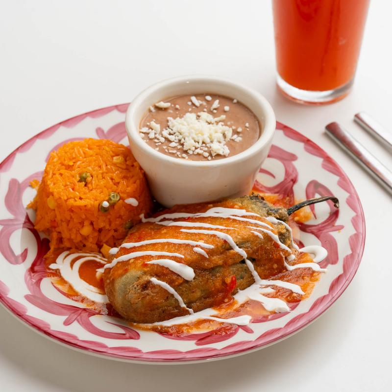 A fire-roasted poblano pepper generously stuffed with seasoned ground beef and tender potatoes, then dipped in a light batter and fried until golden. Smothered in our housemade sauce and served with a side of rice and refried bean