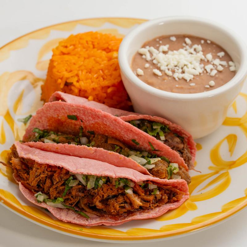 A delicious trio of pink corn or freshly made flour tortillas filled with your choice of protein—barbacoa, brisket, or carne con chile. Served with rice and