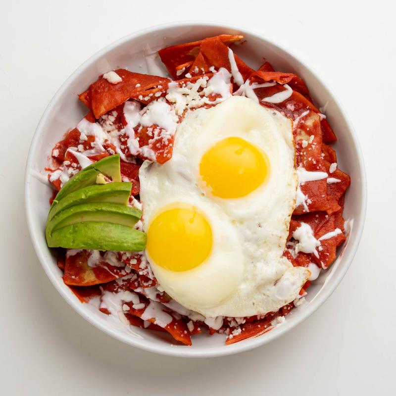 Crunchy house made chips in your choice of spicy red or green salsa, topped with crema, queso fresco, two fried eggs, and avocado • Add barbacoa, brisket, carne con chile, chicken tinga $4.00