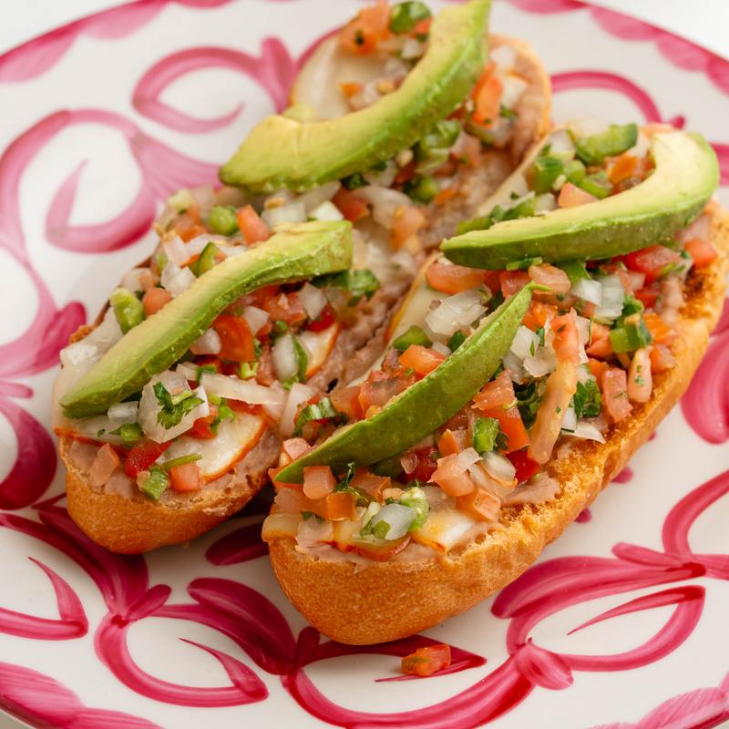 Toasted bolillo roll topped with refried beans, melted cheese, pico de gallo & avocado • Add barbacoa, brisket, carne con chile, eggs $4.00