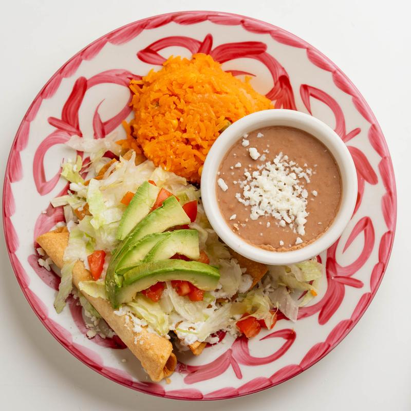 Four crispy tortilla shells filled with savory chicken, topped with sour cream, lettuce, tomato, queso fresco, and avocado. Served with rice and beans