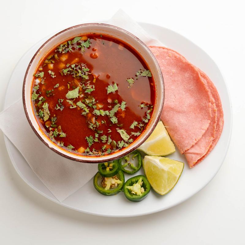 Mexican soup made with tender beef tripe, hominy, and spices, simmered to perfection. Served with fresh cilantro, onions, serranos, lime, and a bolillo • Available Saturday & Sunday